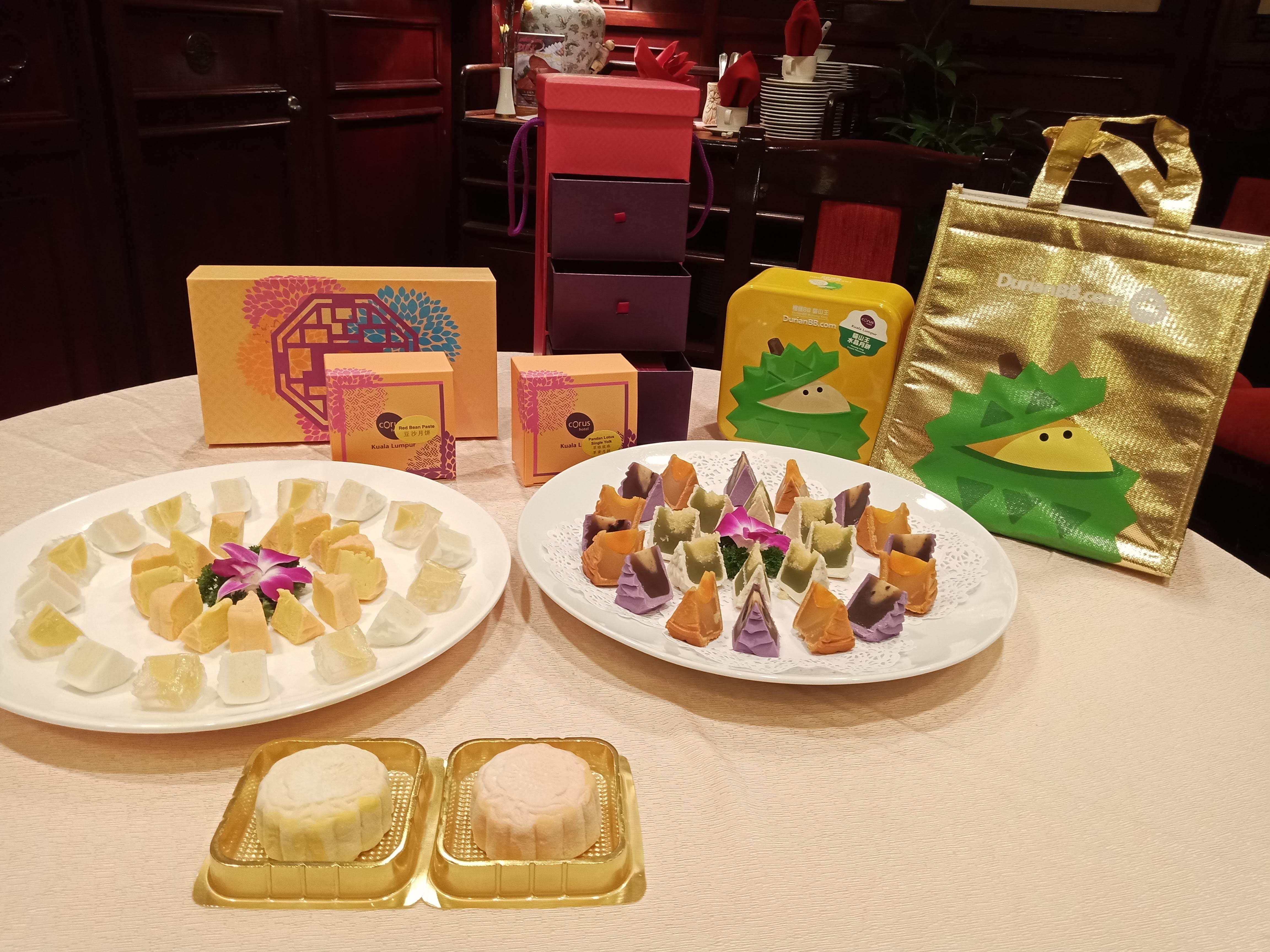 Corus also include two additional flavours in conjunction to a collaboration with DurianBB. The two flavours are DurianBB Crystal Mooncake, a crystal clear jelly like substance with a rich durian filling and DurianBB Snowy Mooncake, a soft white exterior texture which has a rich creamy concentrated durian filling.